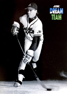 Tom Glavine, member of the MLB Hall of Fame, dressed in his Braves uniform and playing hockey? Odd combination to say the least, but definitely a keeper!